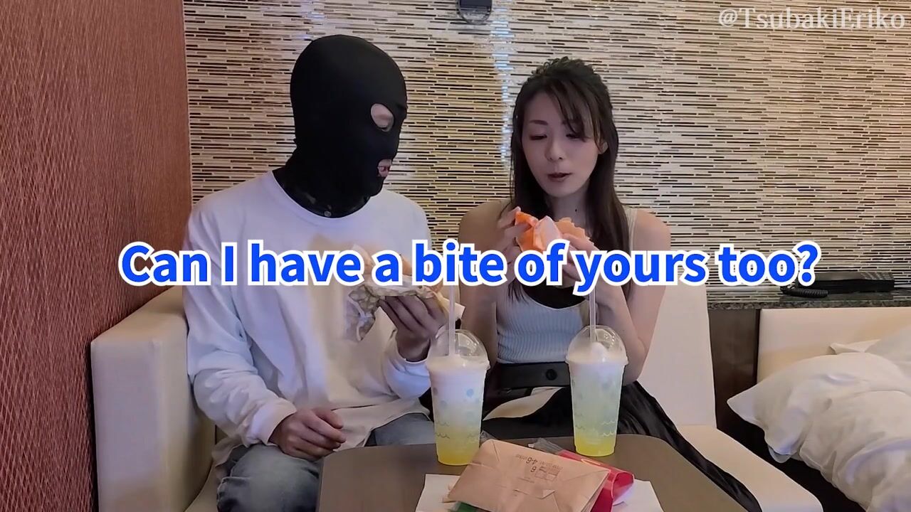 Feeding him a hamburger mouth-to-mouth! Handjob with deep kiss, his dick is harder than ever before