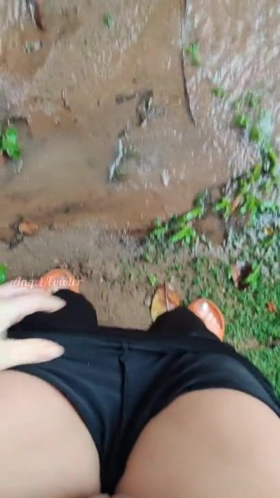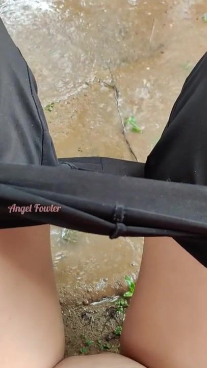 Girl pissing in a puddle in the pouring rain on the side of the road