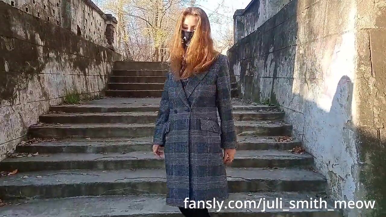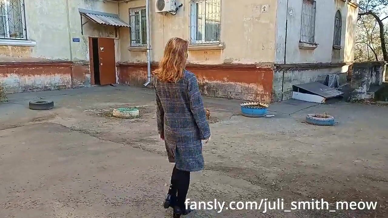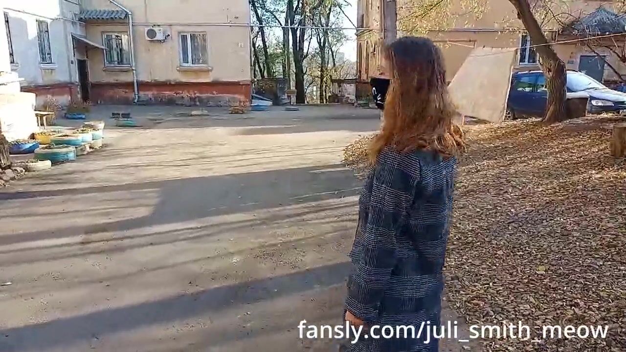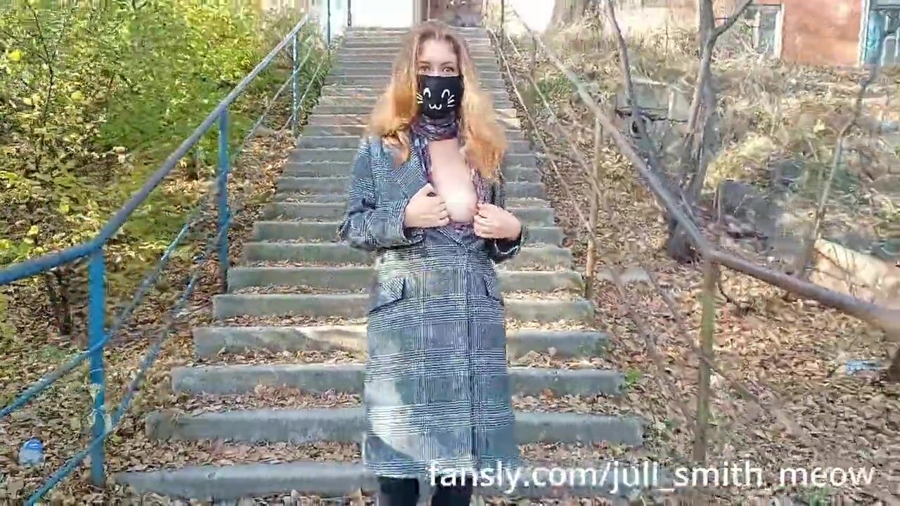 Horny female in a coat flashes tits and pussy in the neighborhood
