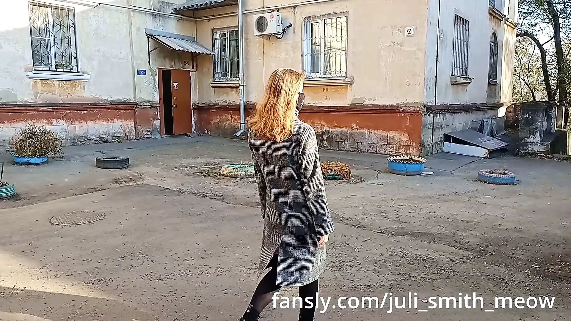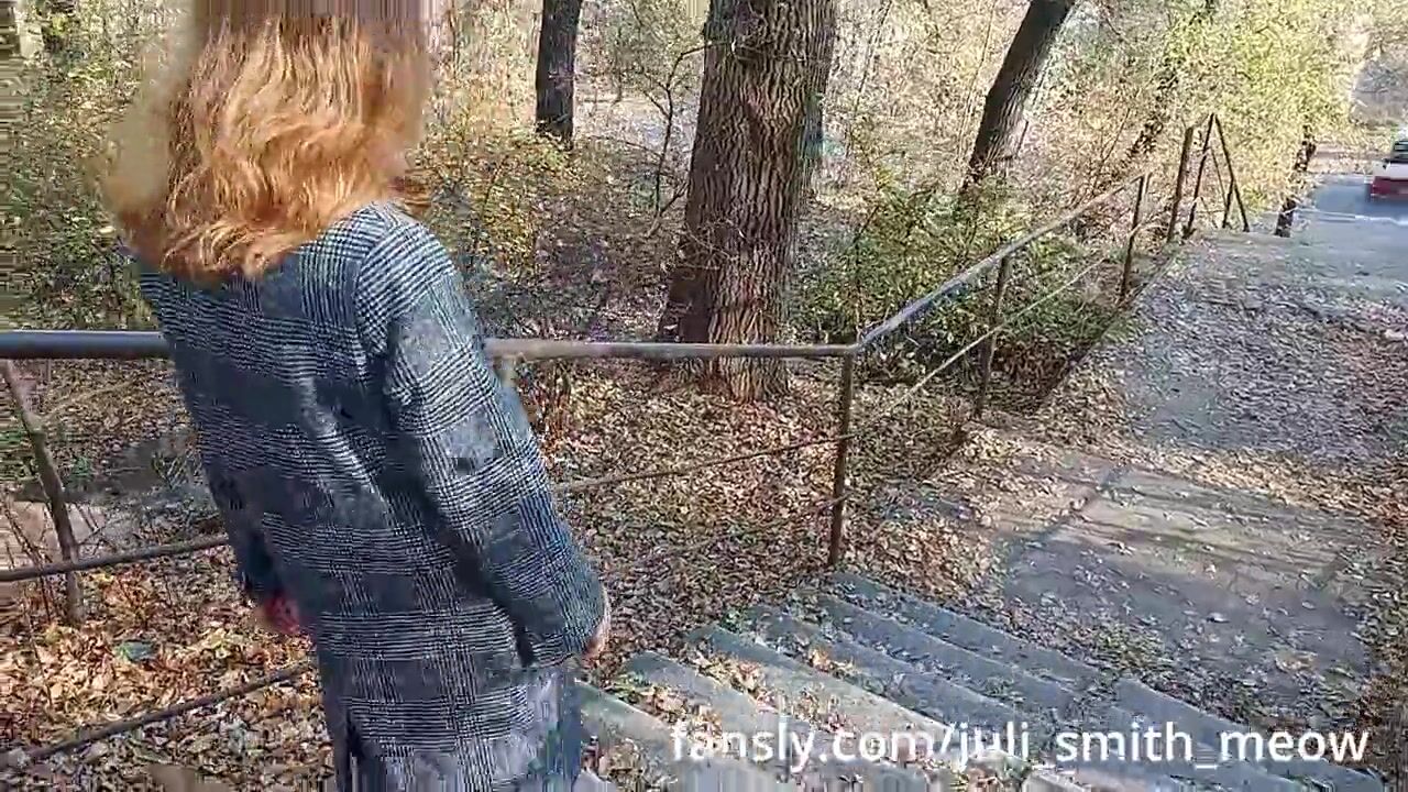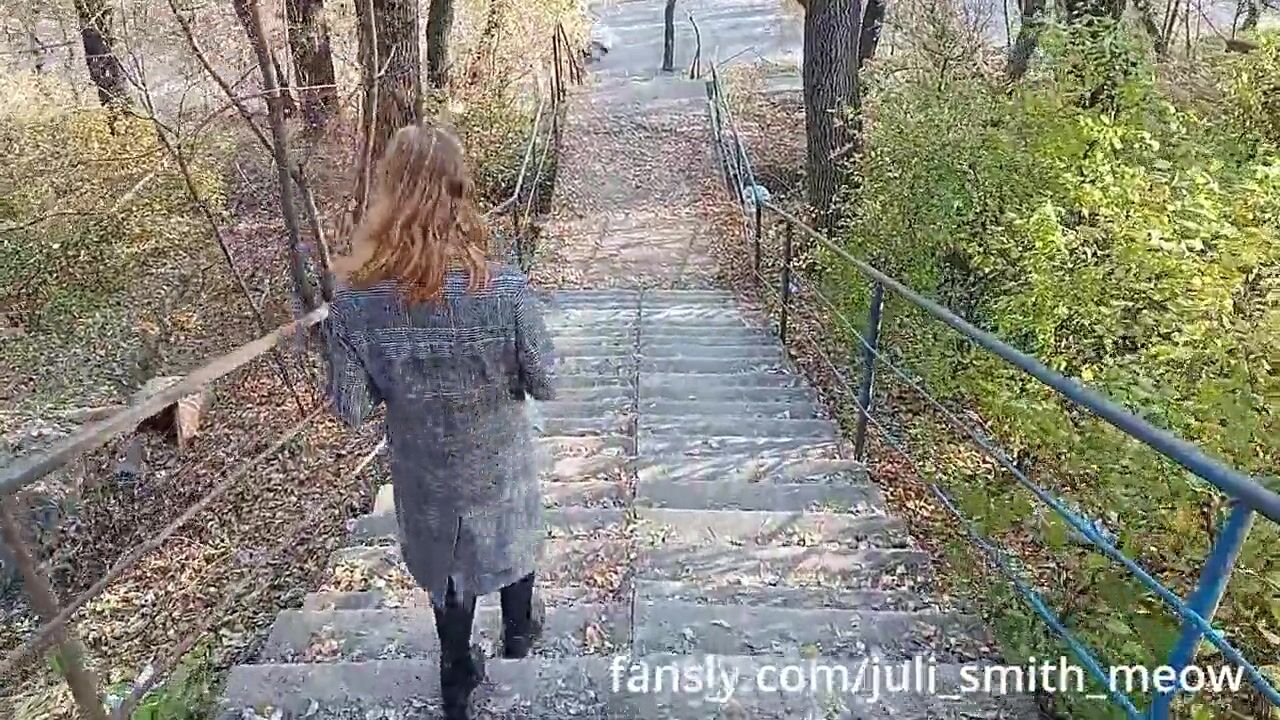 Horny female in a coat flashes tits and pussy in the neighborhood