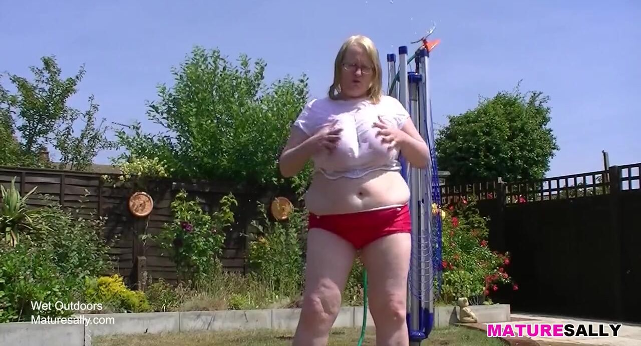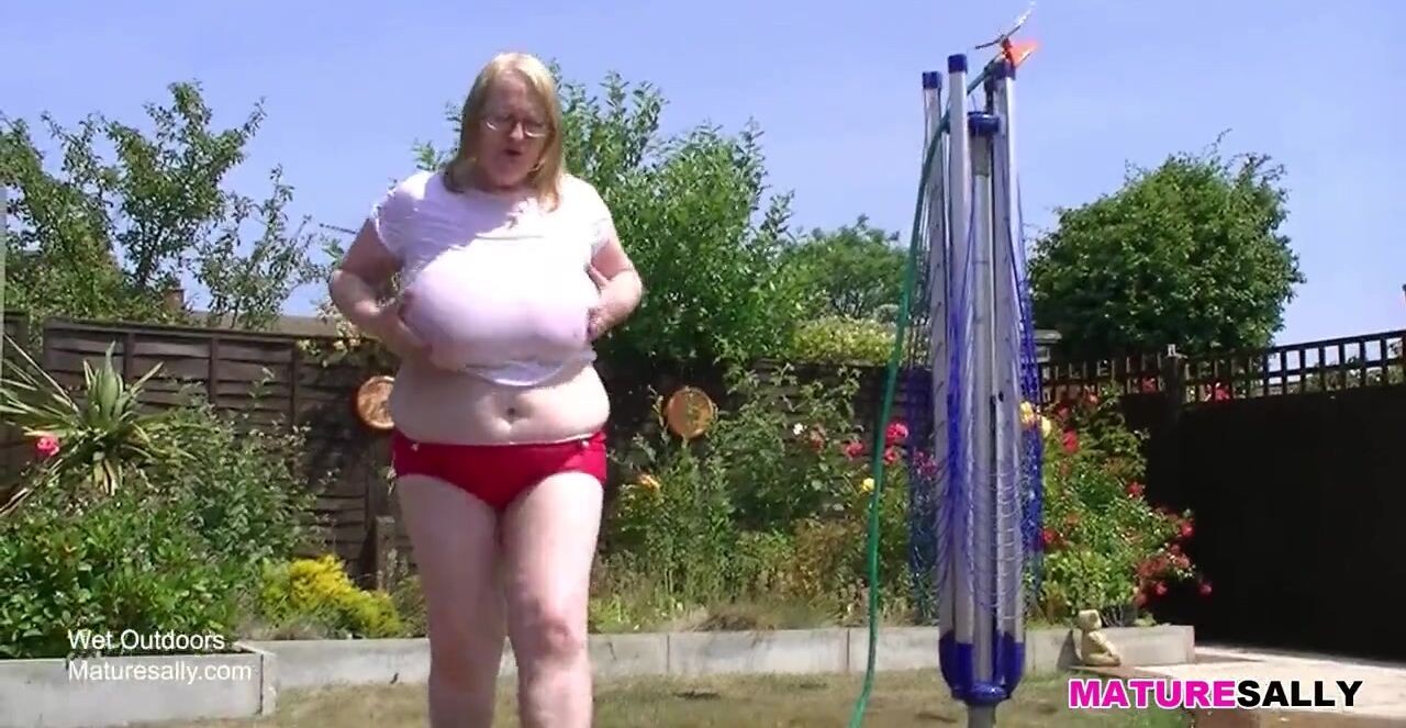 Huge granny tits getting wet in the garden