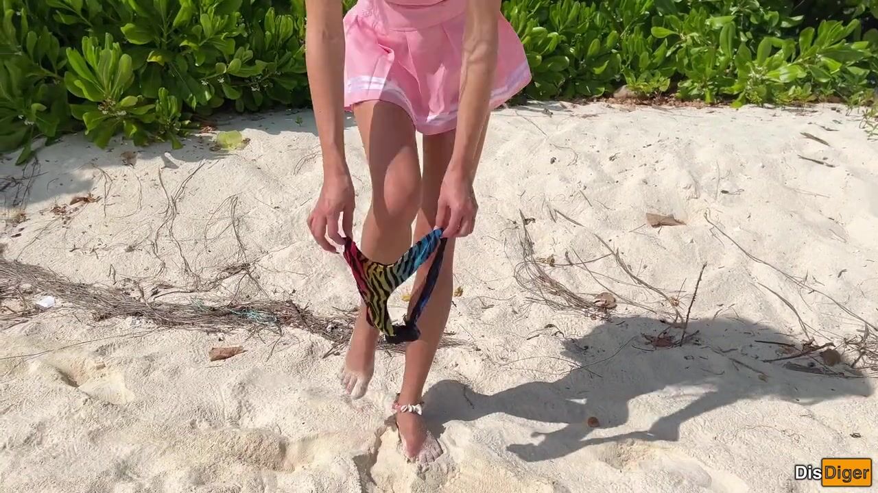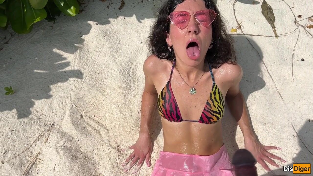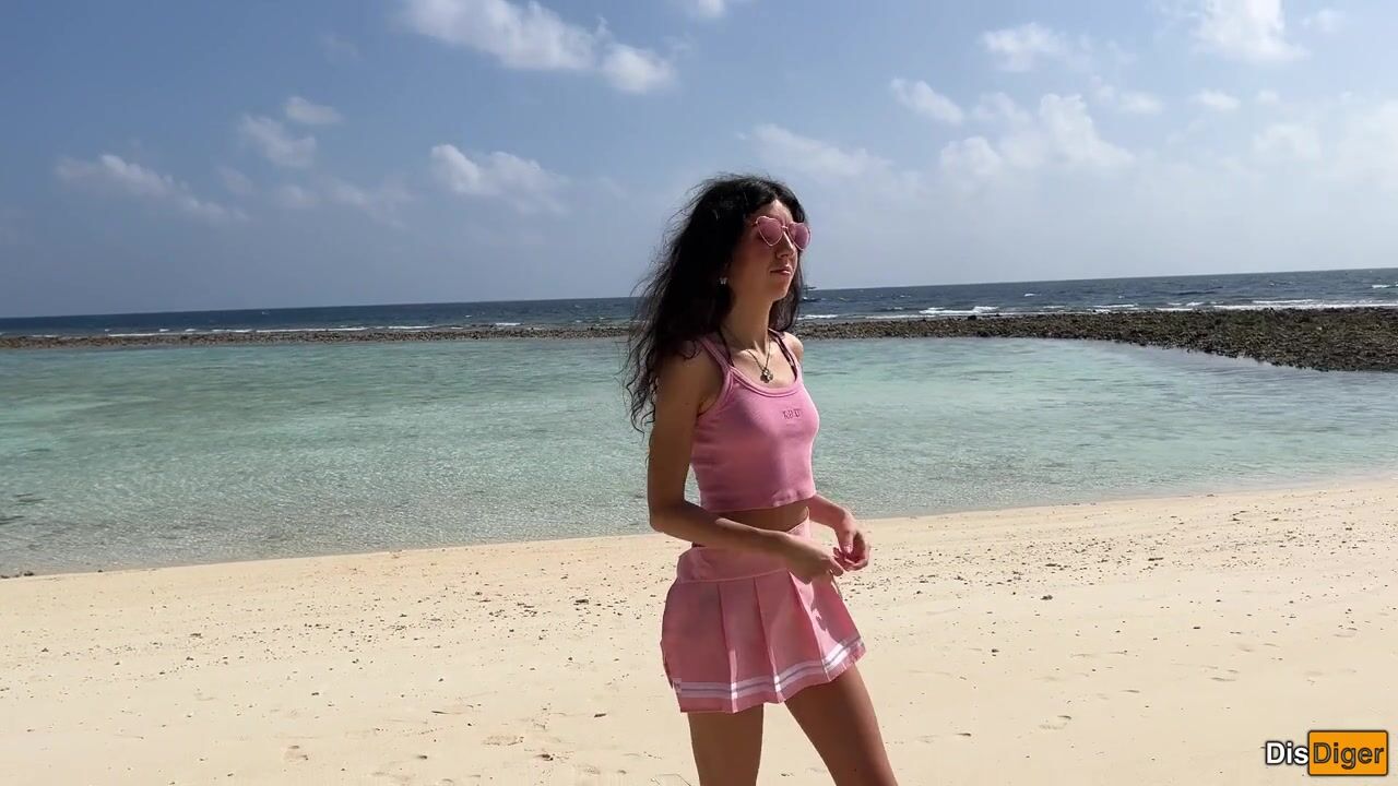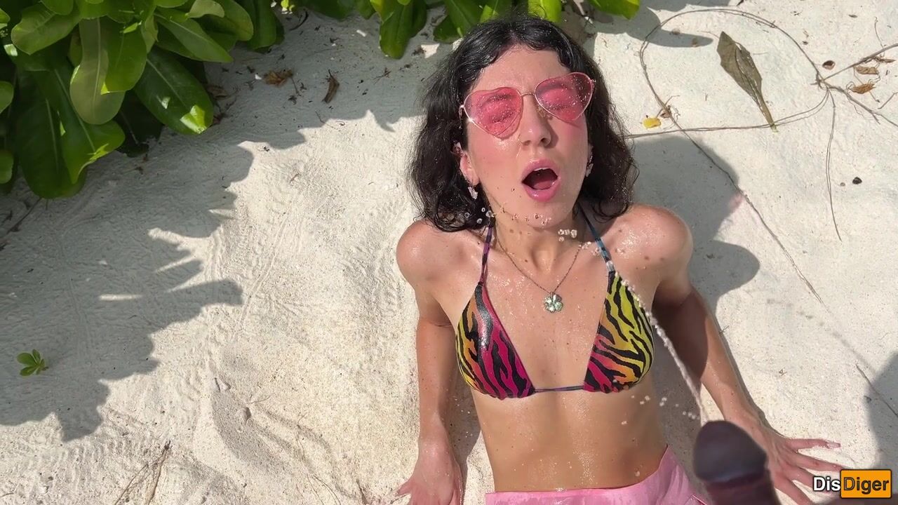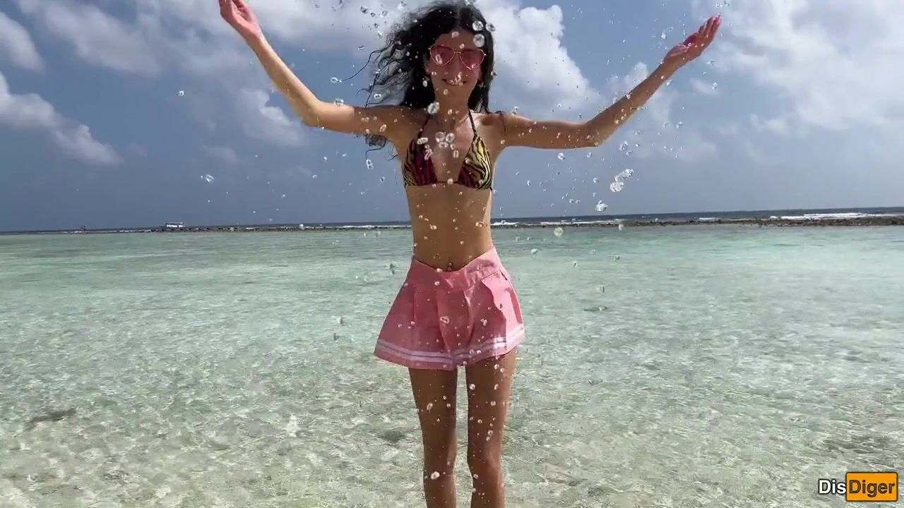 Katty pees powerfully on the beach and I give her golden shower on her face