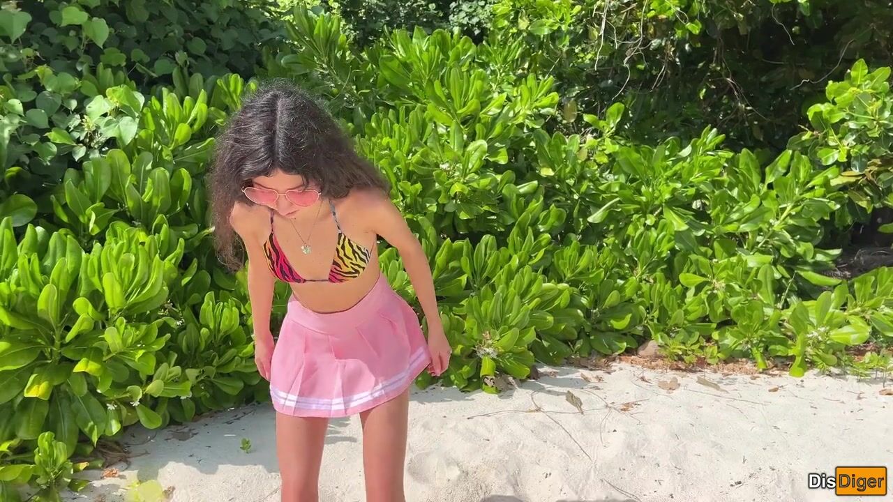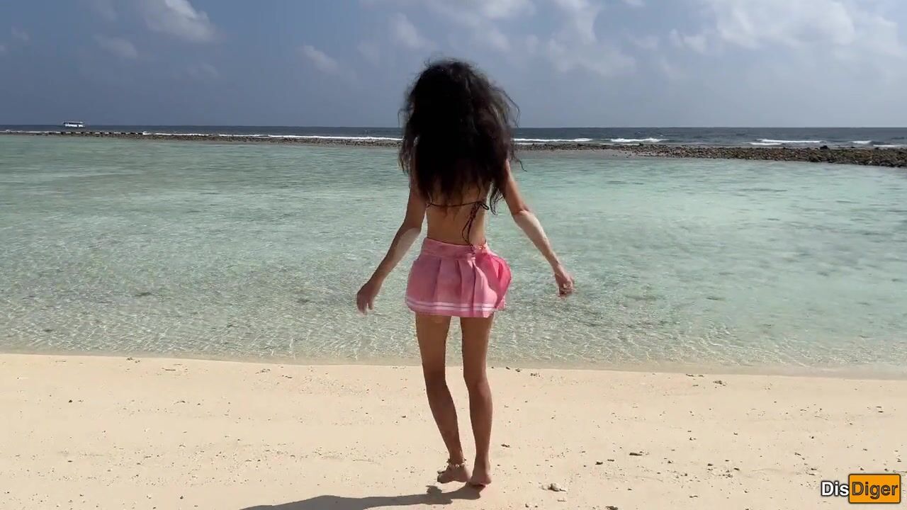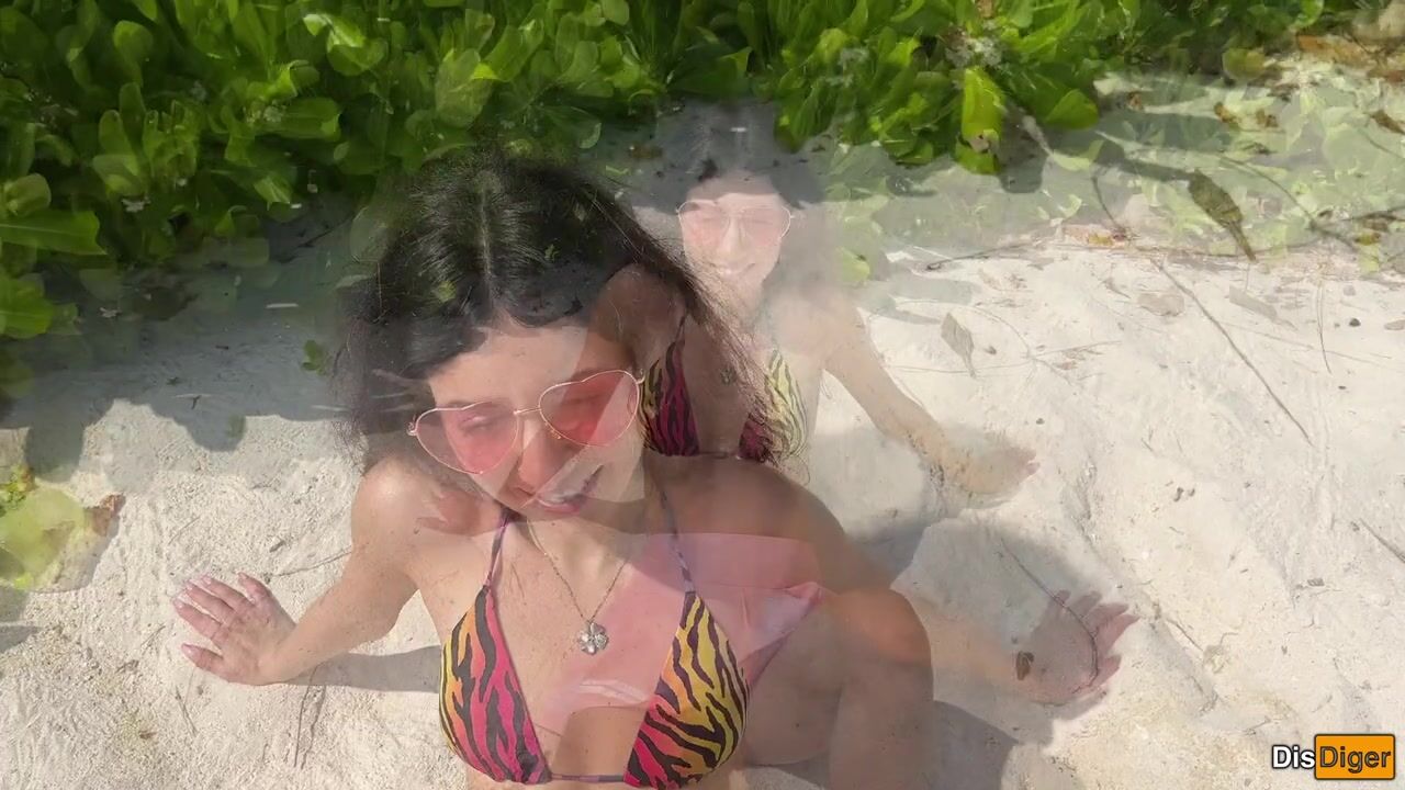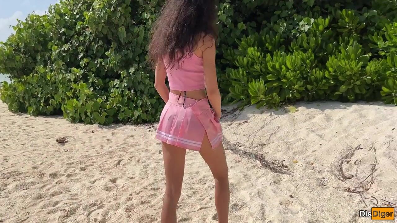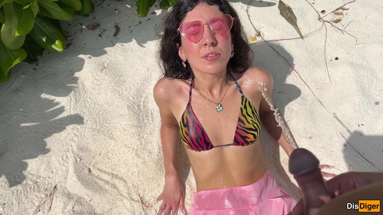 Katty pees powerfully on the beach and I give her golden shower on her face