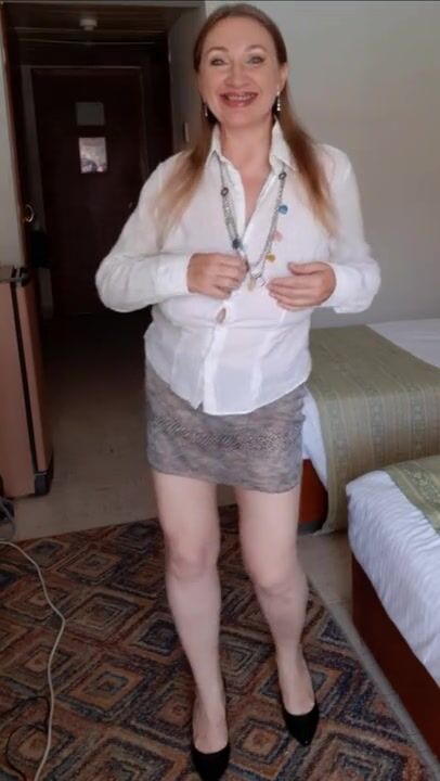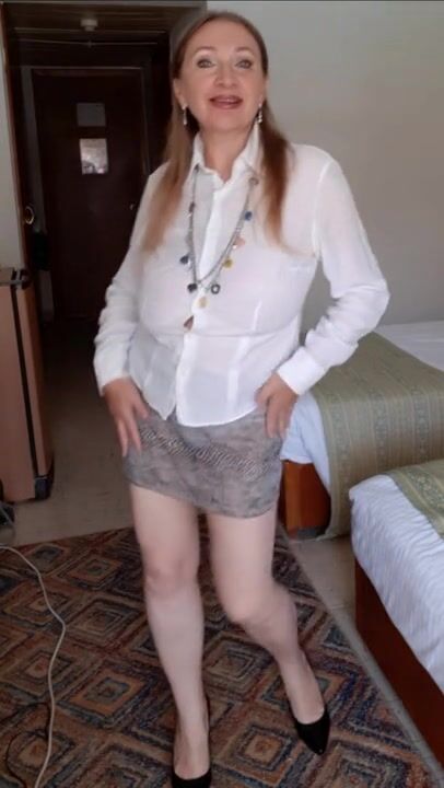 MariaOld milf with huge saggy boobs teasing withour bra, shaved pussy.