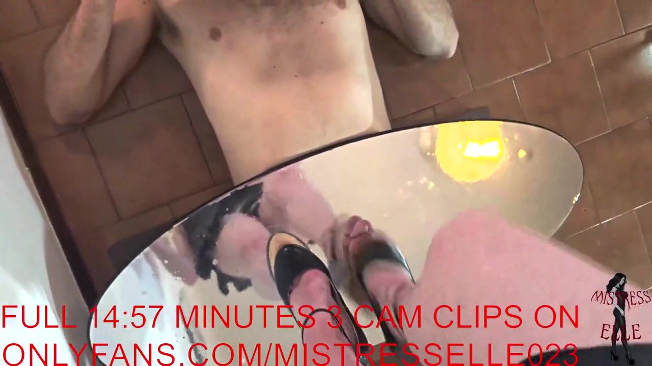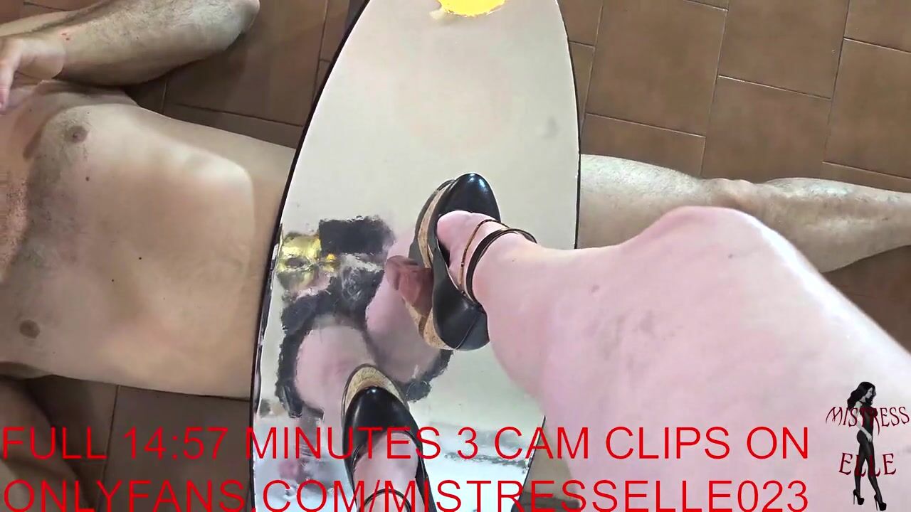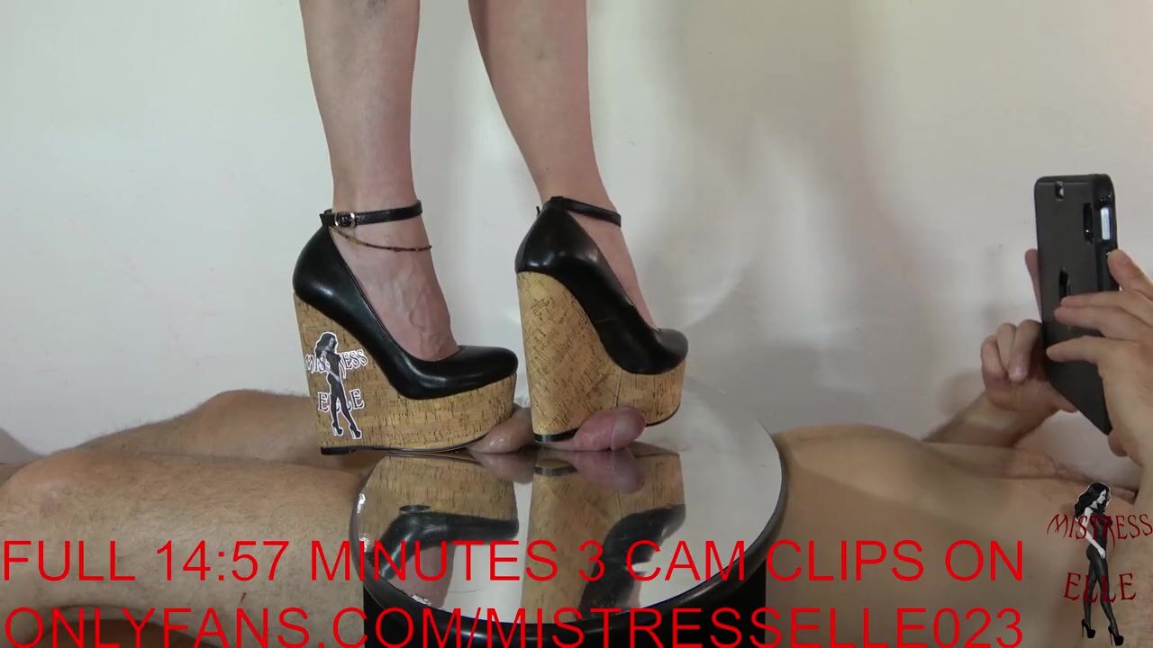 Mistress Elle in wedges flattens her slave's cock