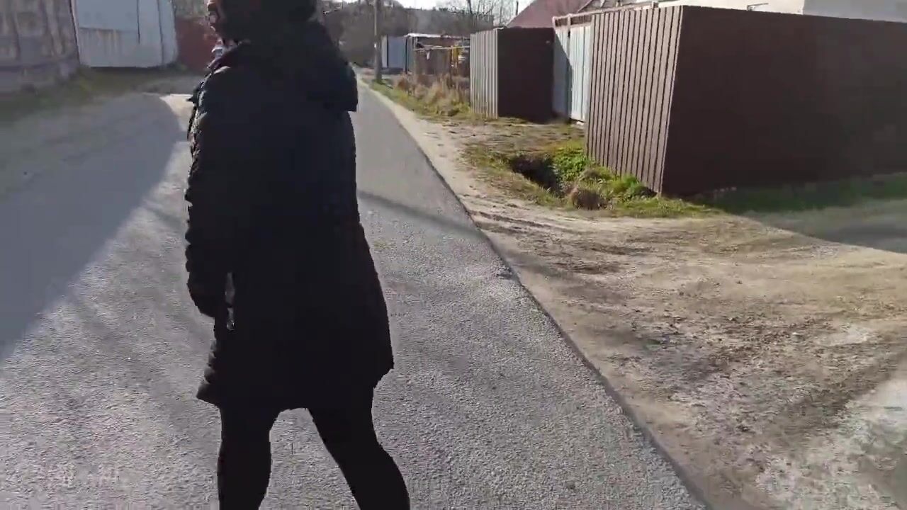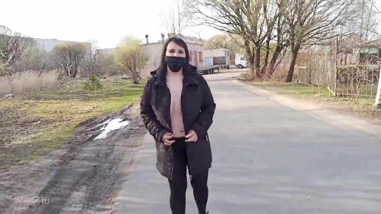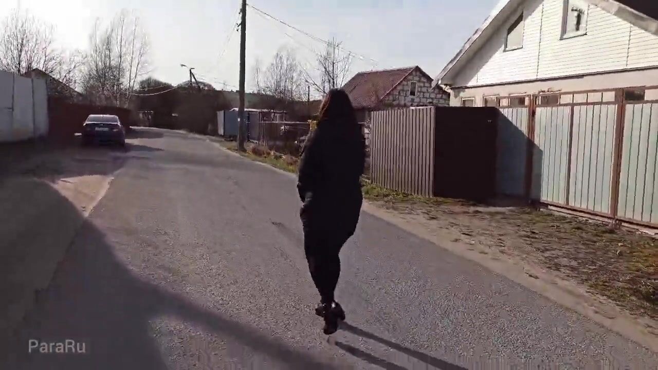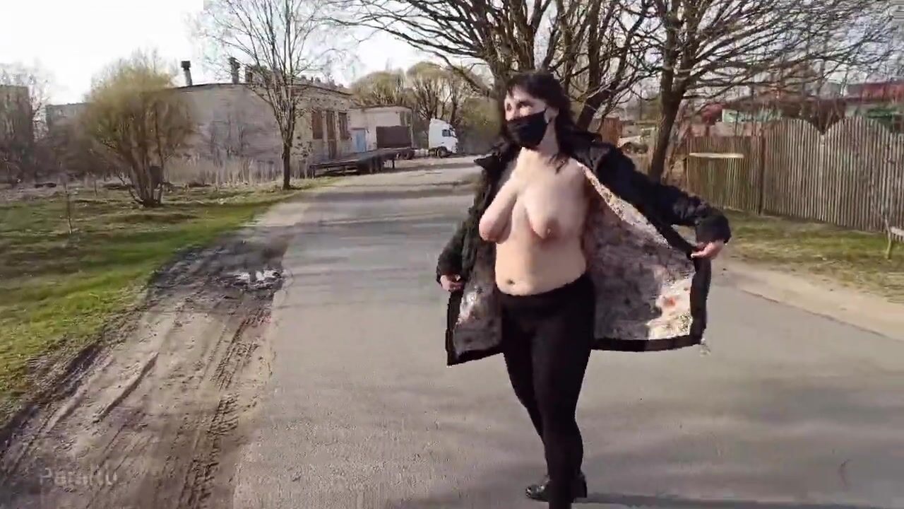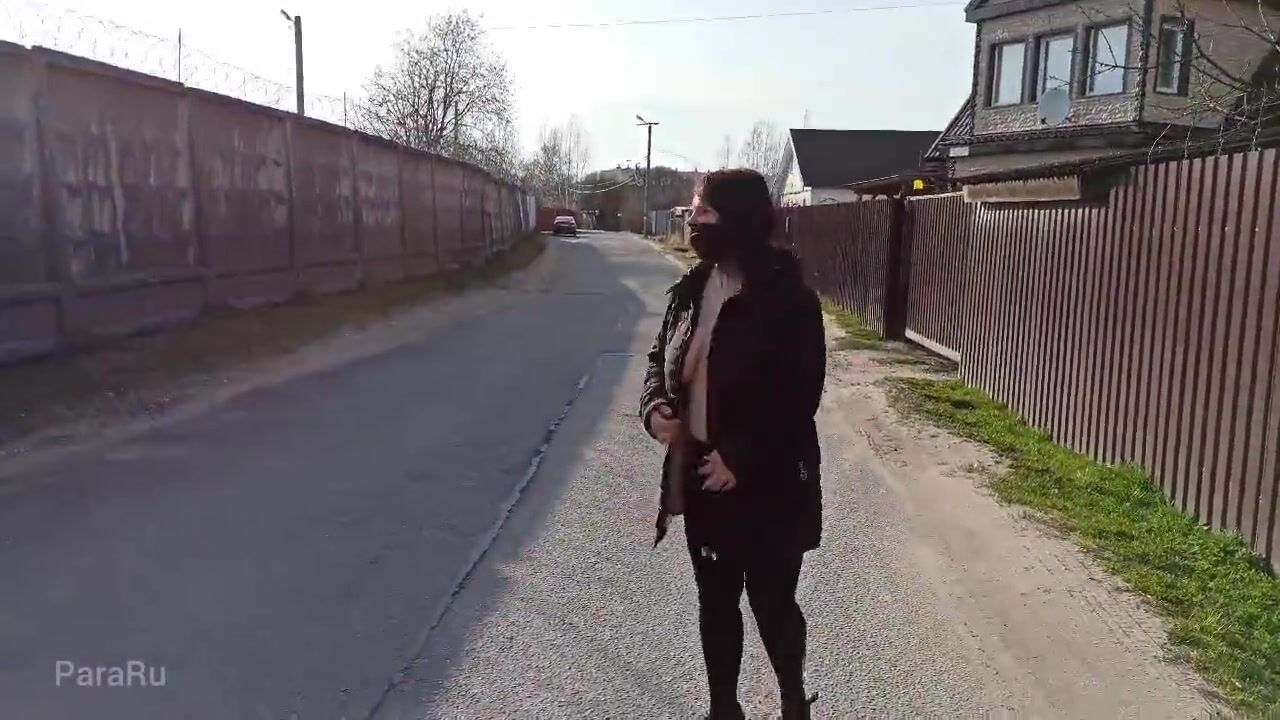Naked, shameless wife walks down the street in a public place