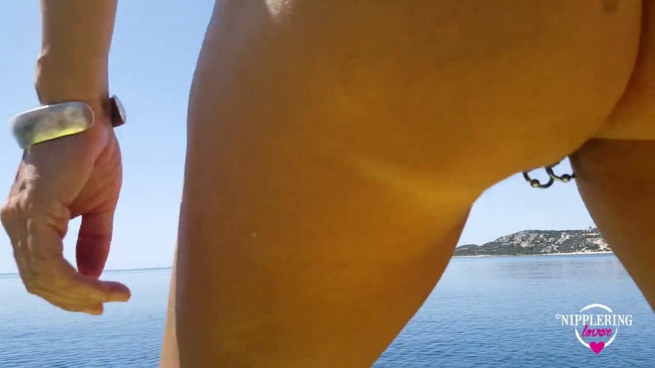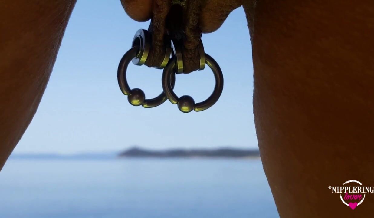 nippleringlover peeing naked at sea flashing large gauge pierced nipples & stretched pussy piercings