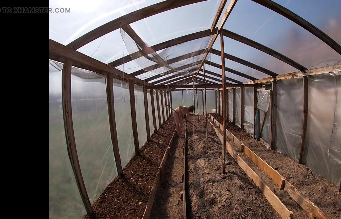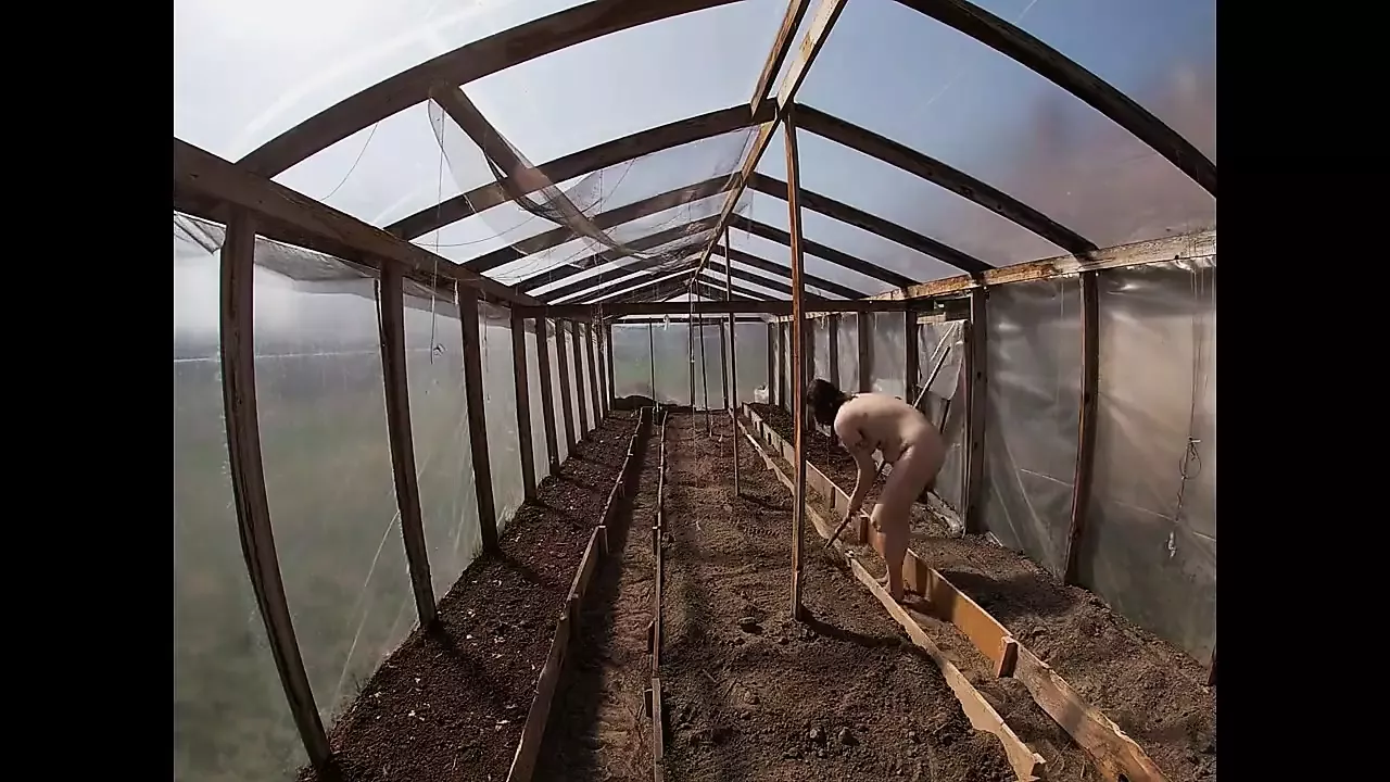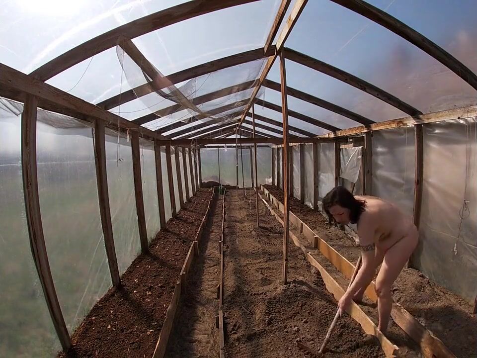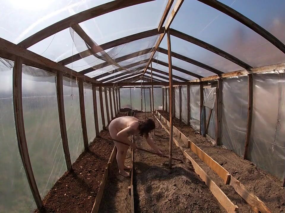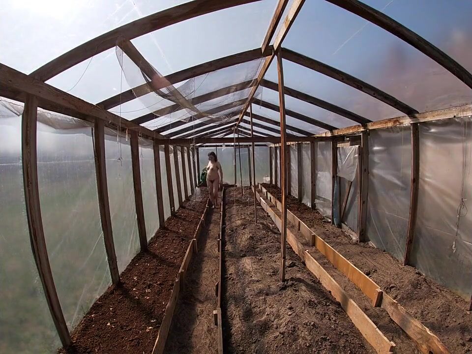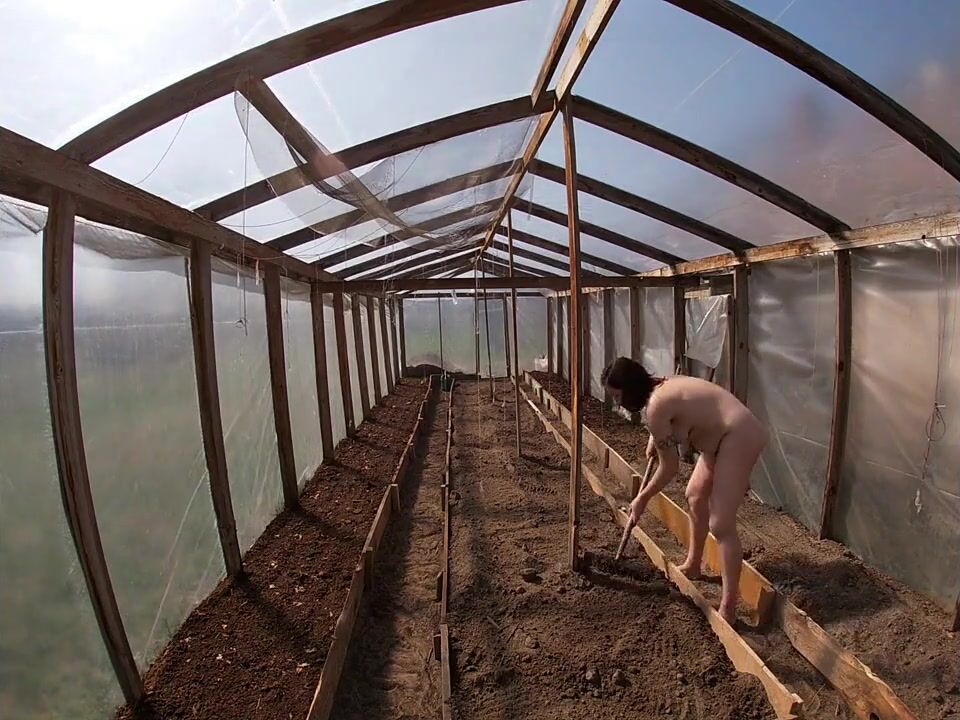 Nude house wife working in the greenhouse