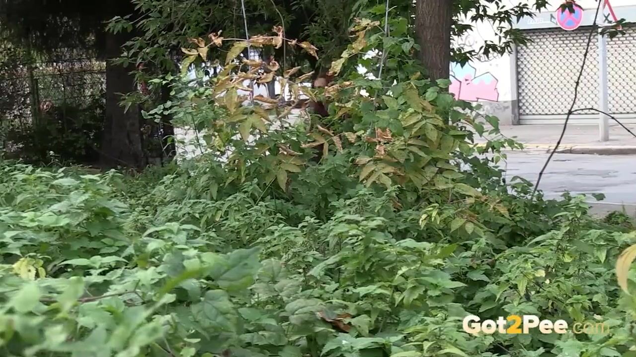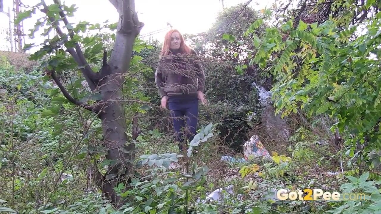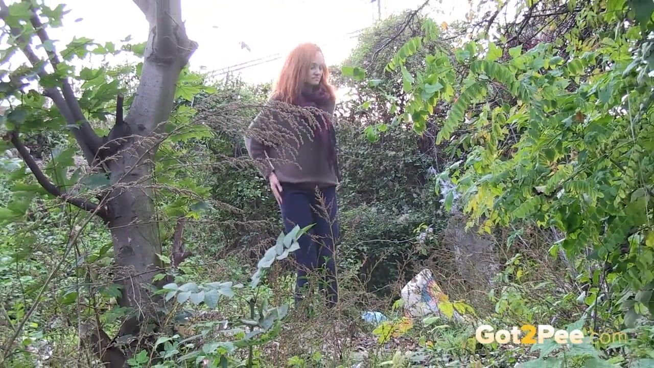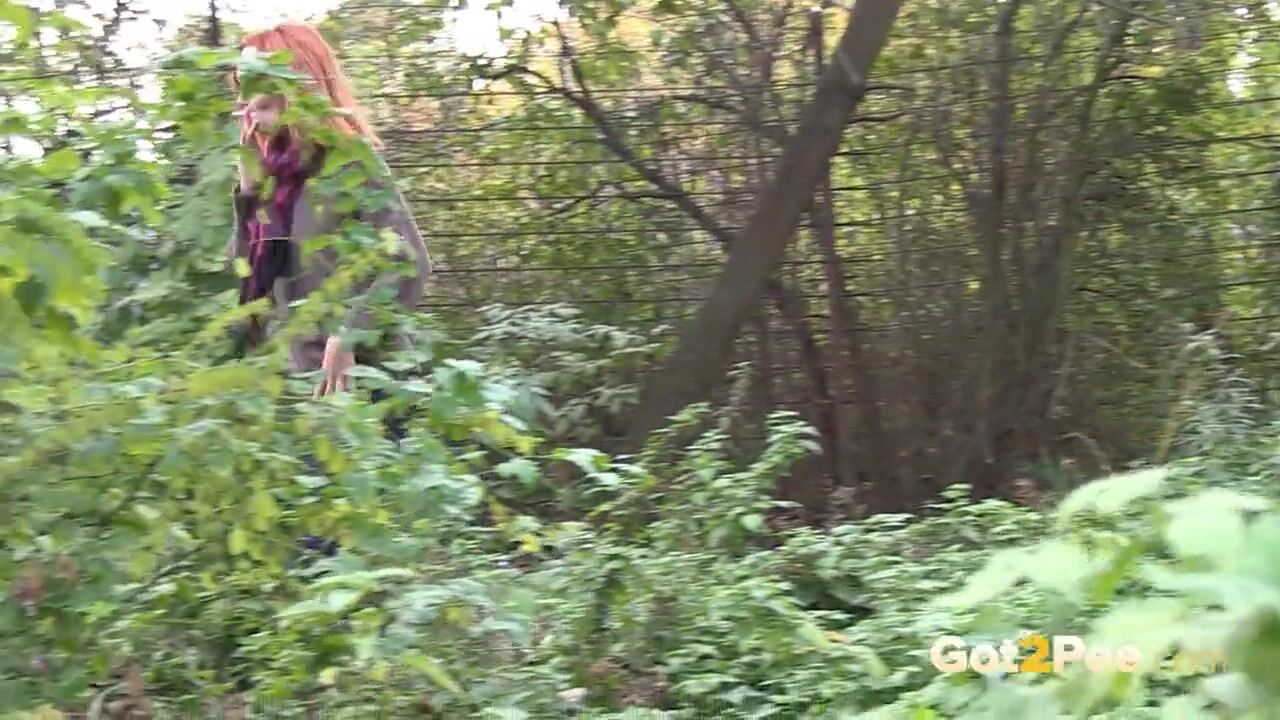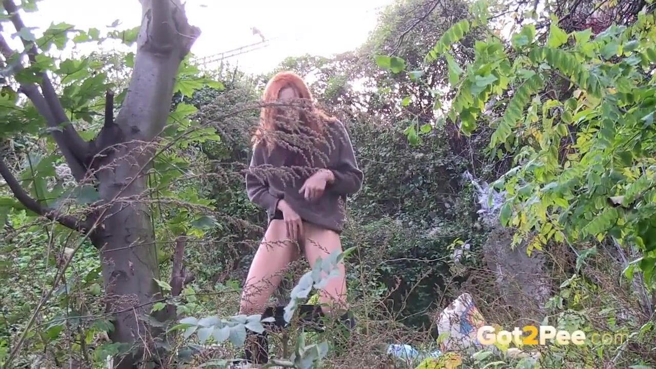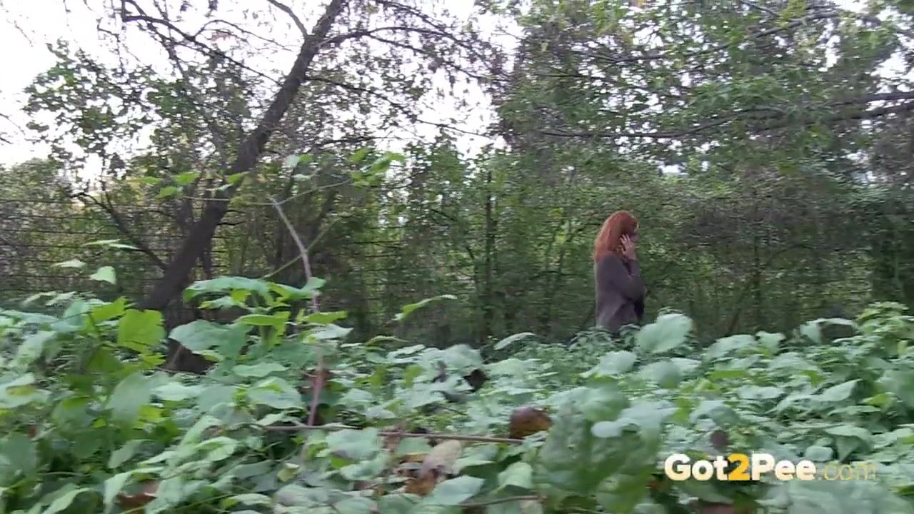 Redheaded Babe Pisses Long And Hard In Trees