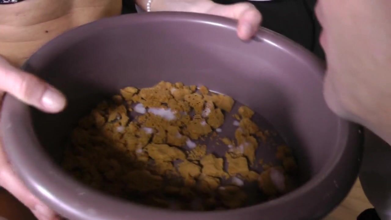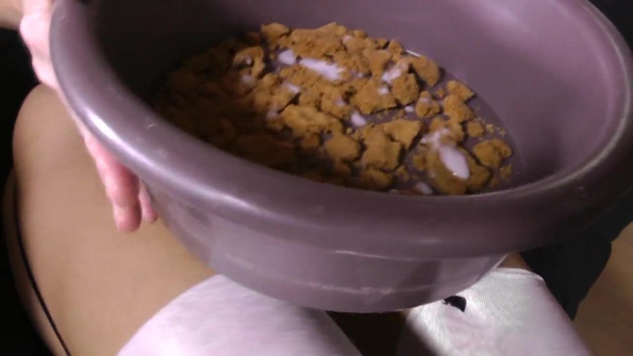 she masturbate her pussy while she watch him eat the condom from the bowl