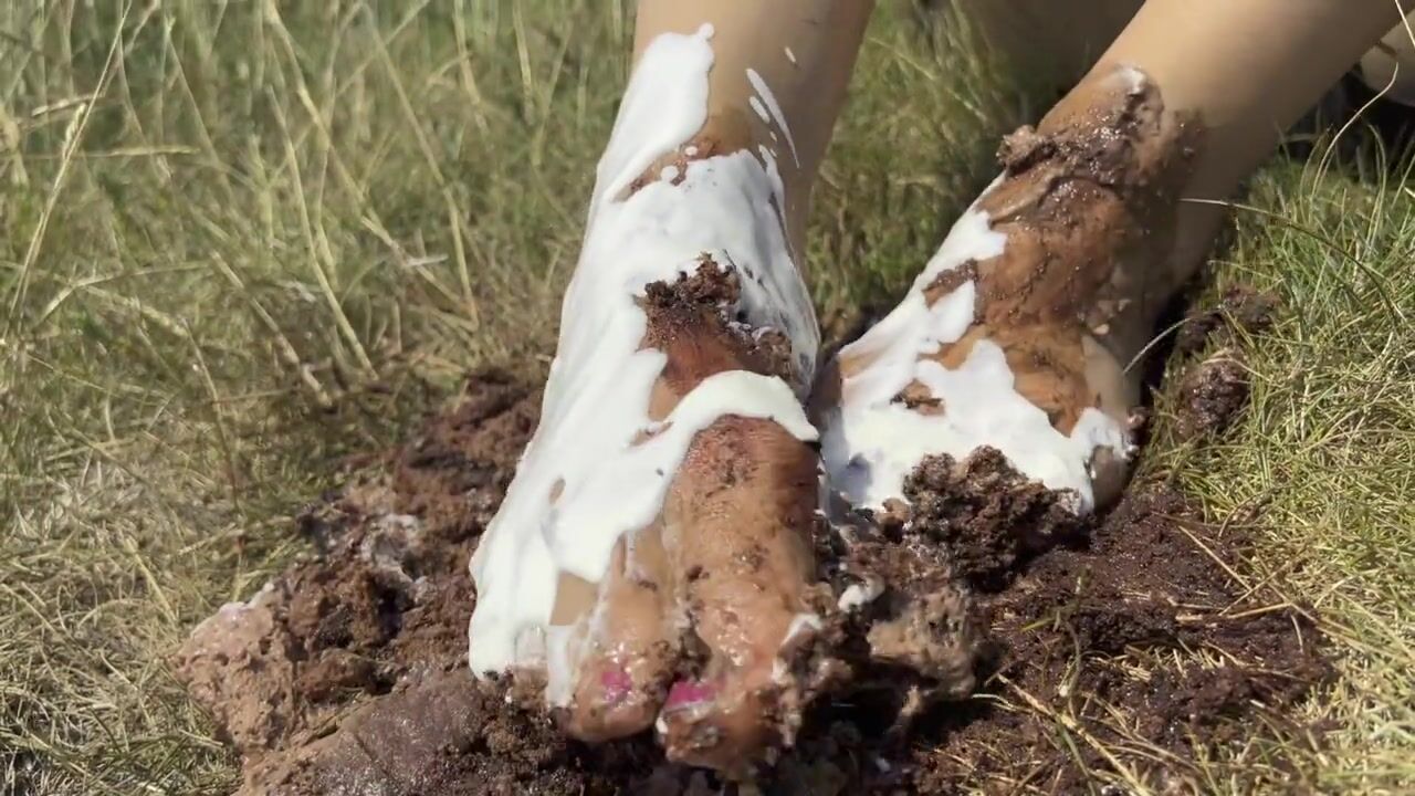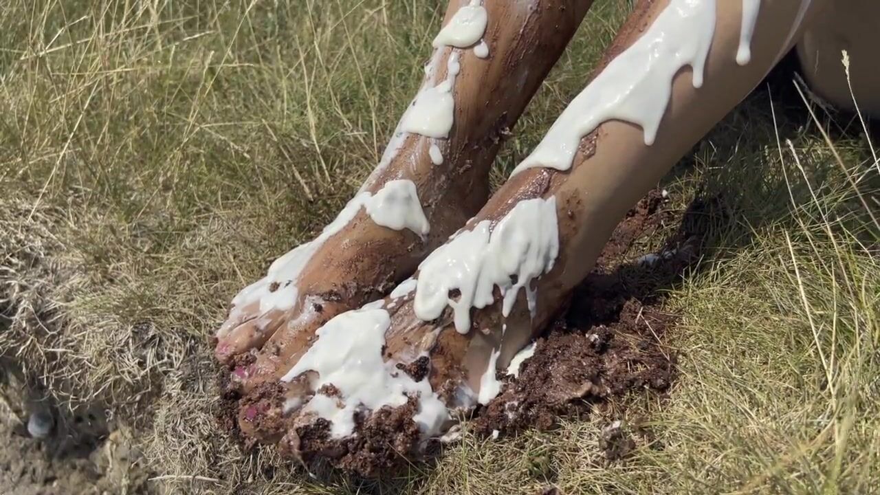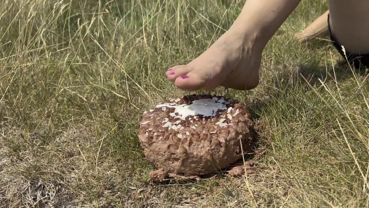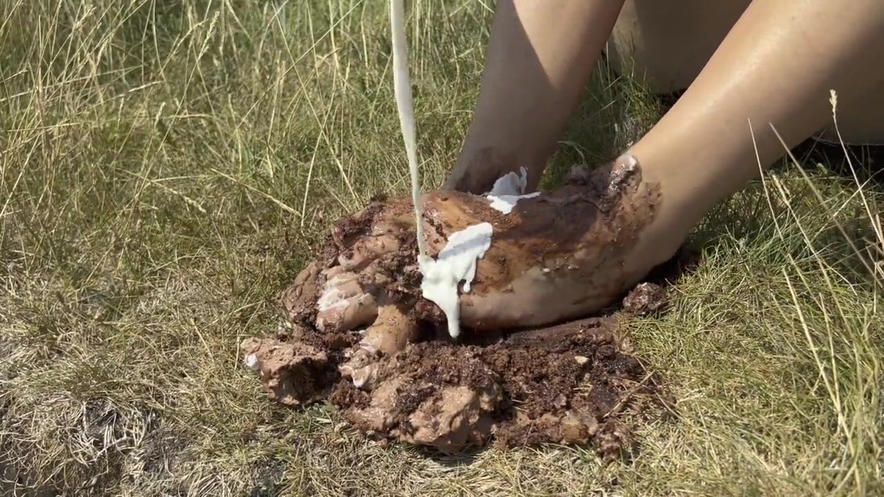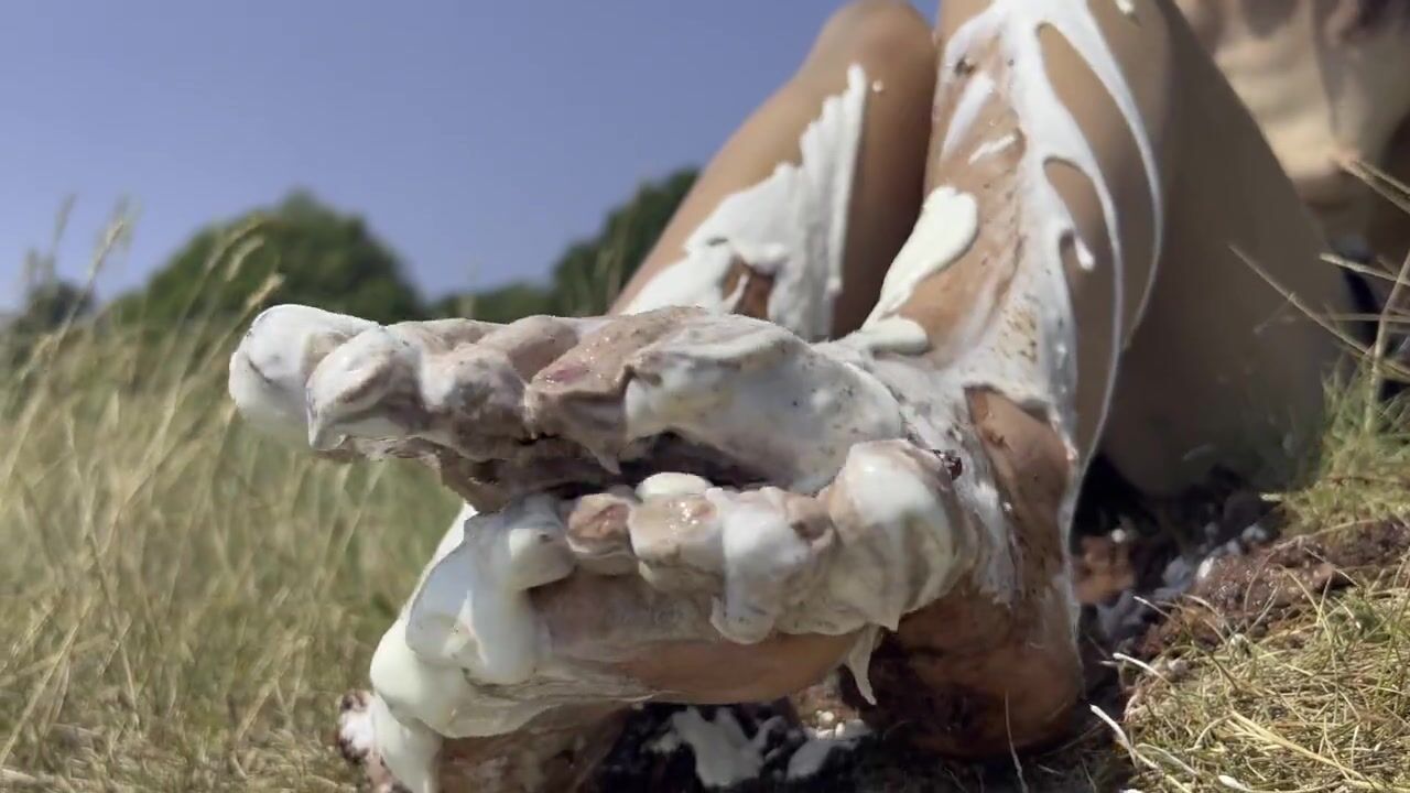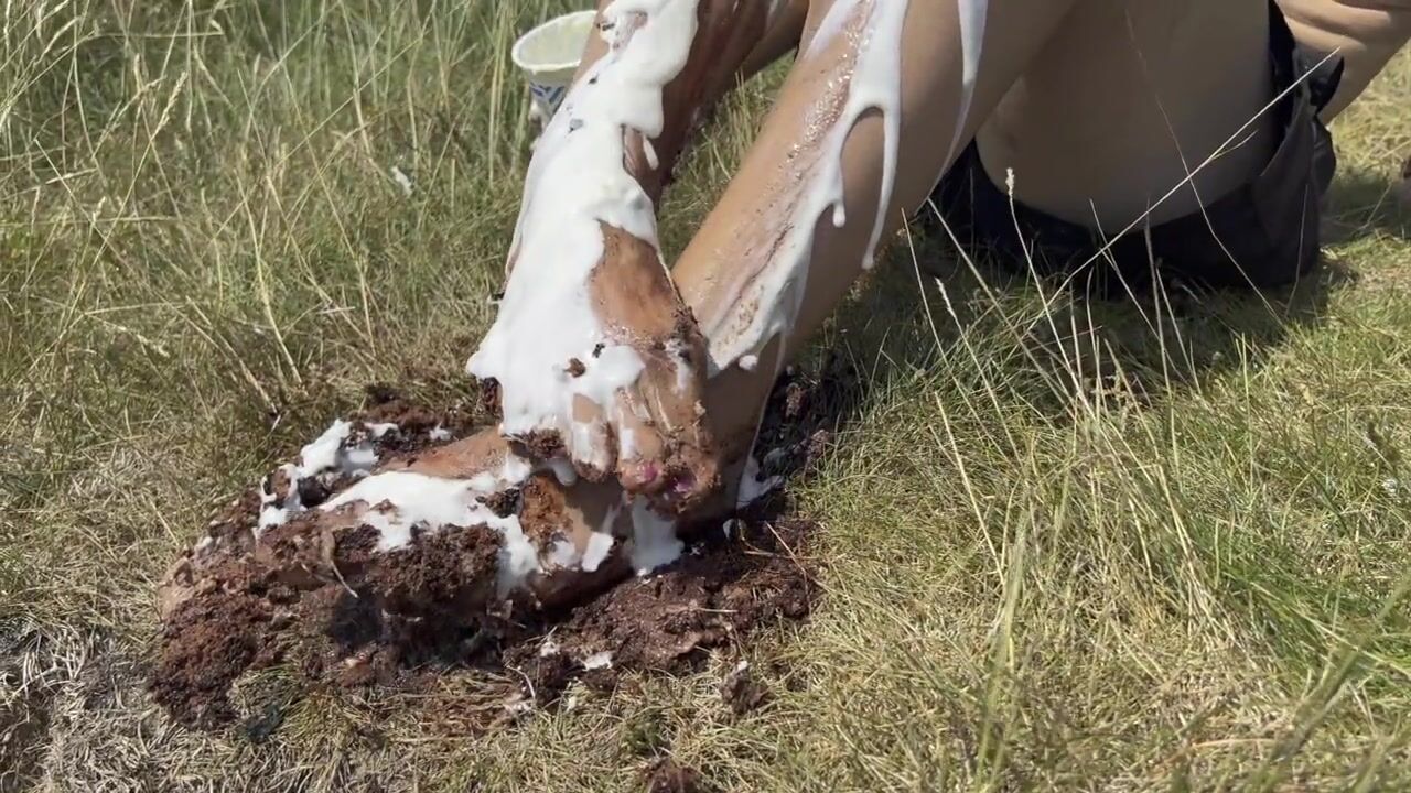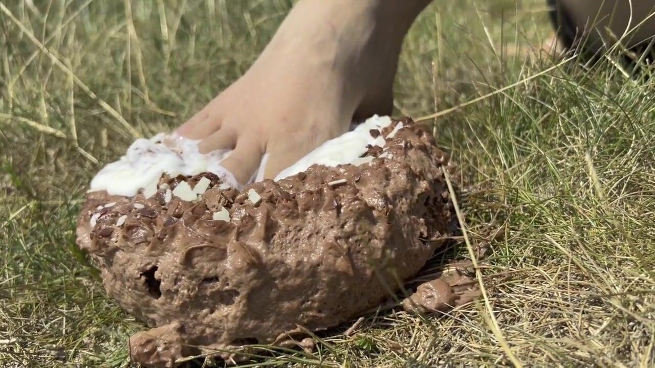 Smashing a cake with my feet. The chocolate and cream gateaux feels so nice between my toes