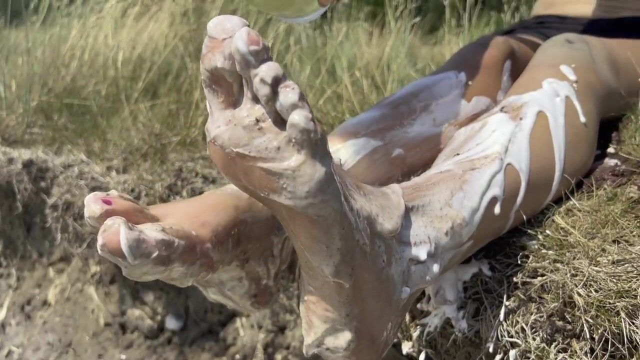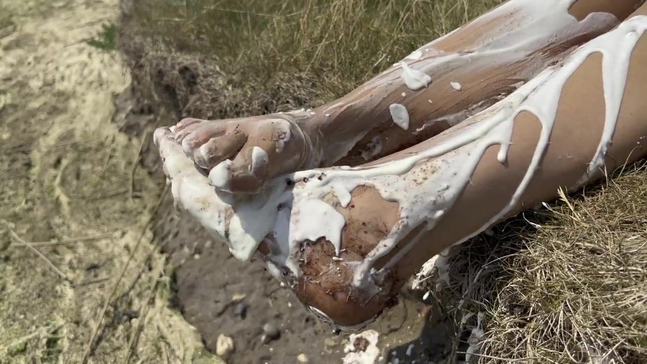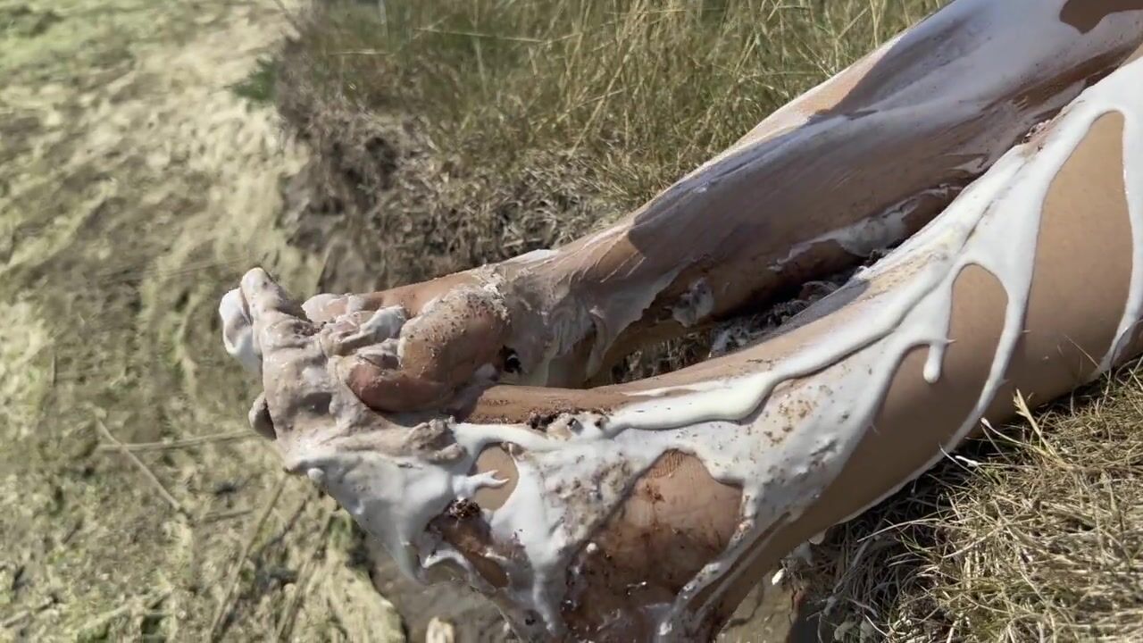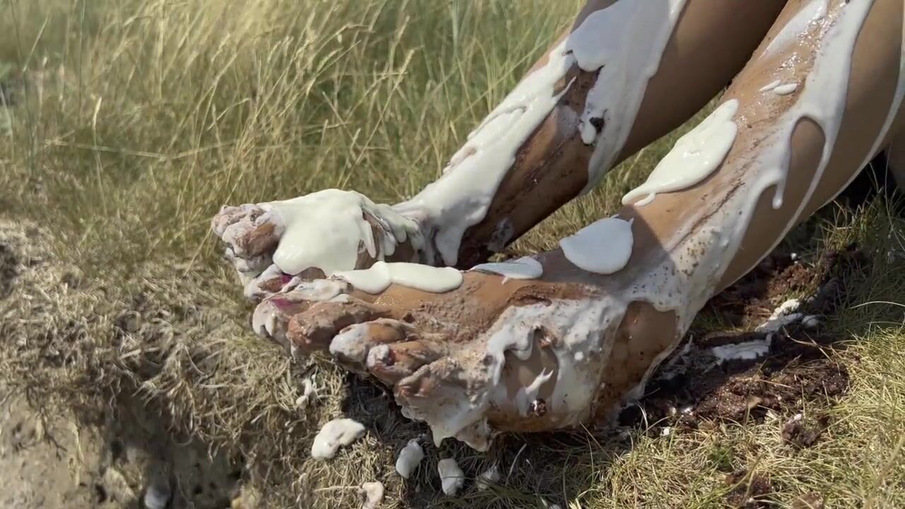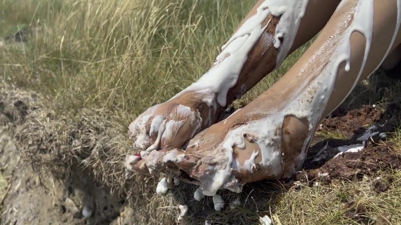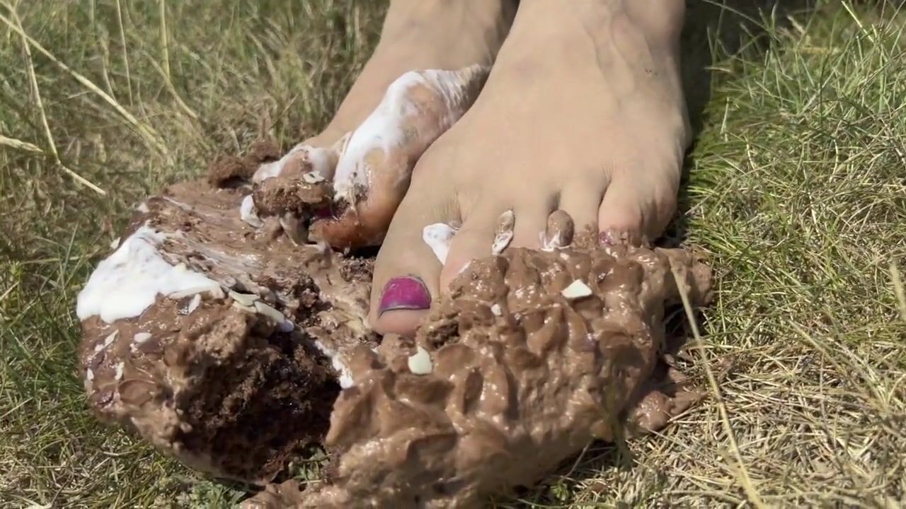 Smashing a cake with my feet. The chocolate and cream gateaux feels so nice between my toes