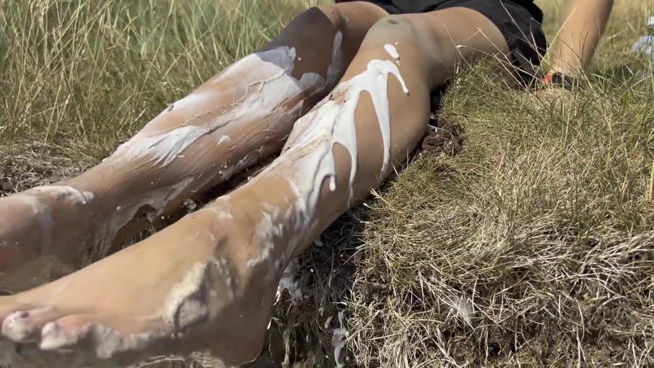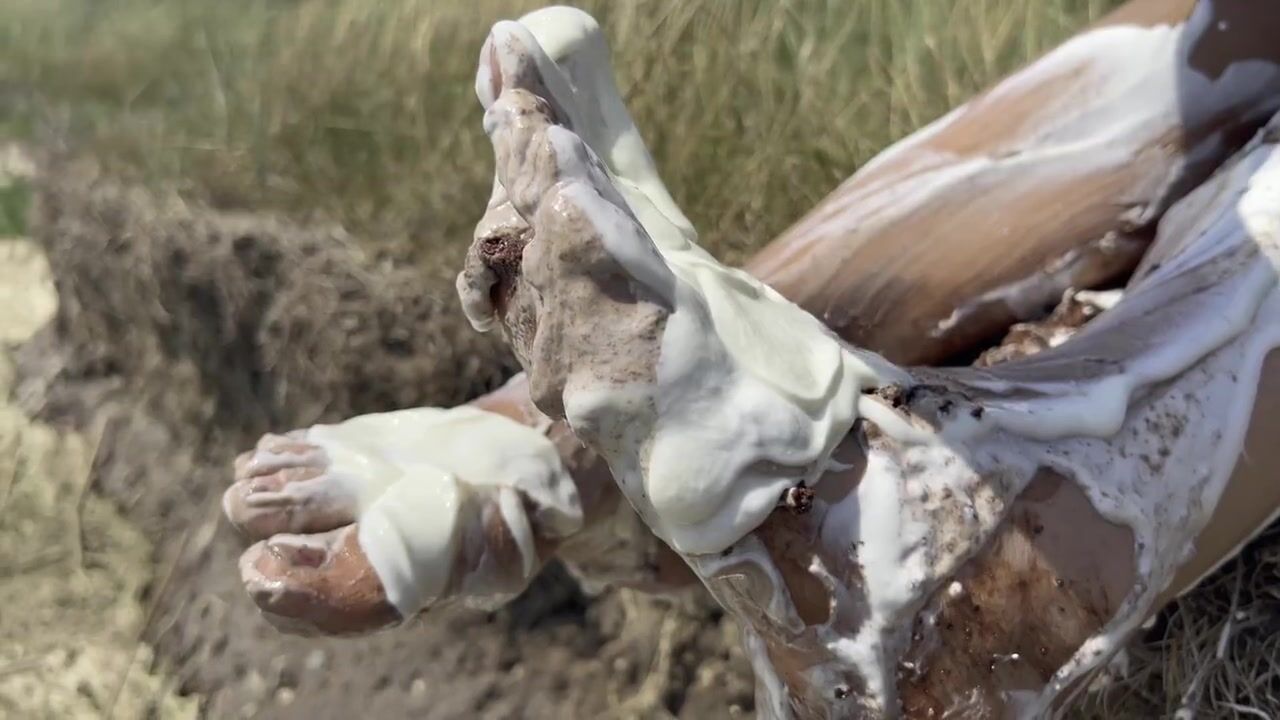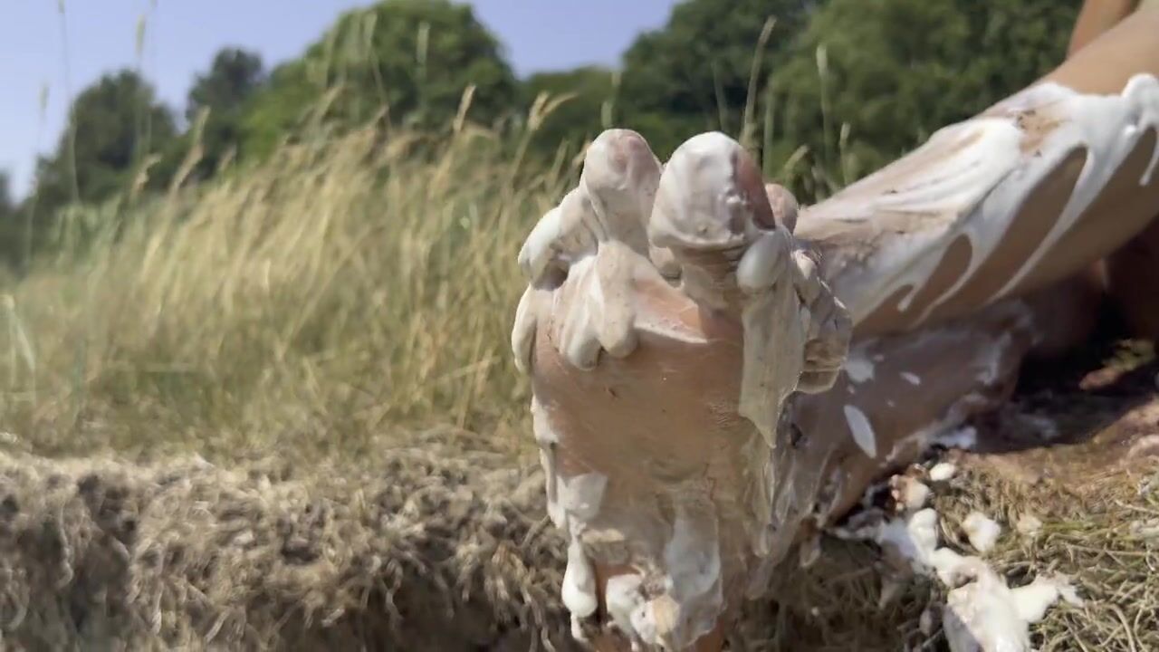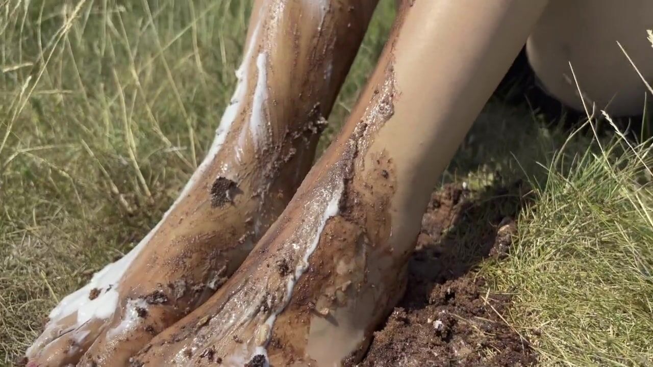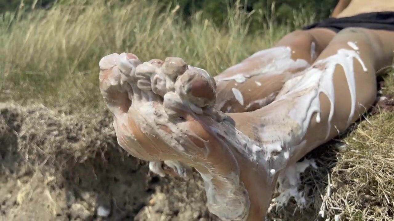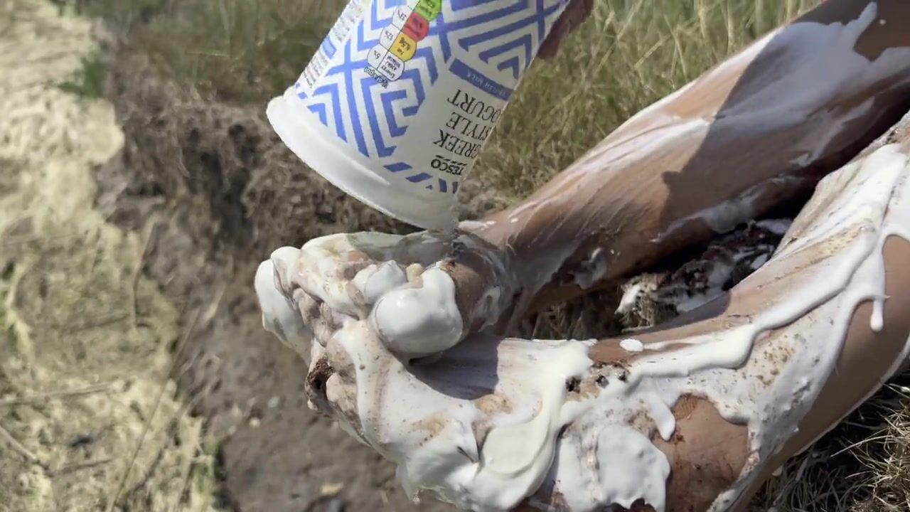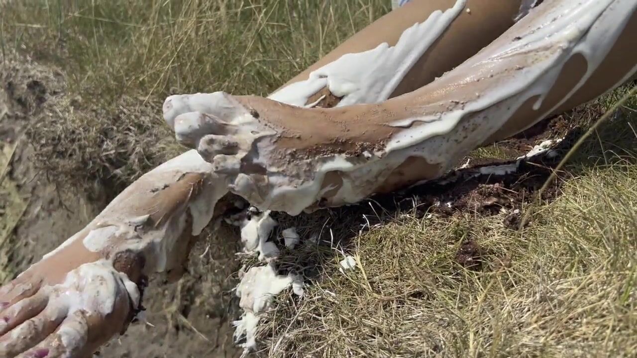 Smashing a cake with my feet. The chocolate and cream gateaux feels so nice between my toes